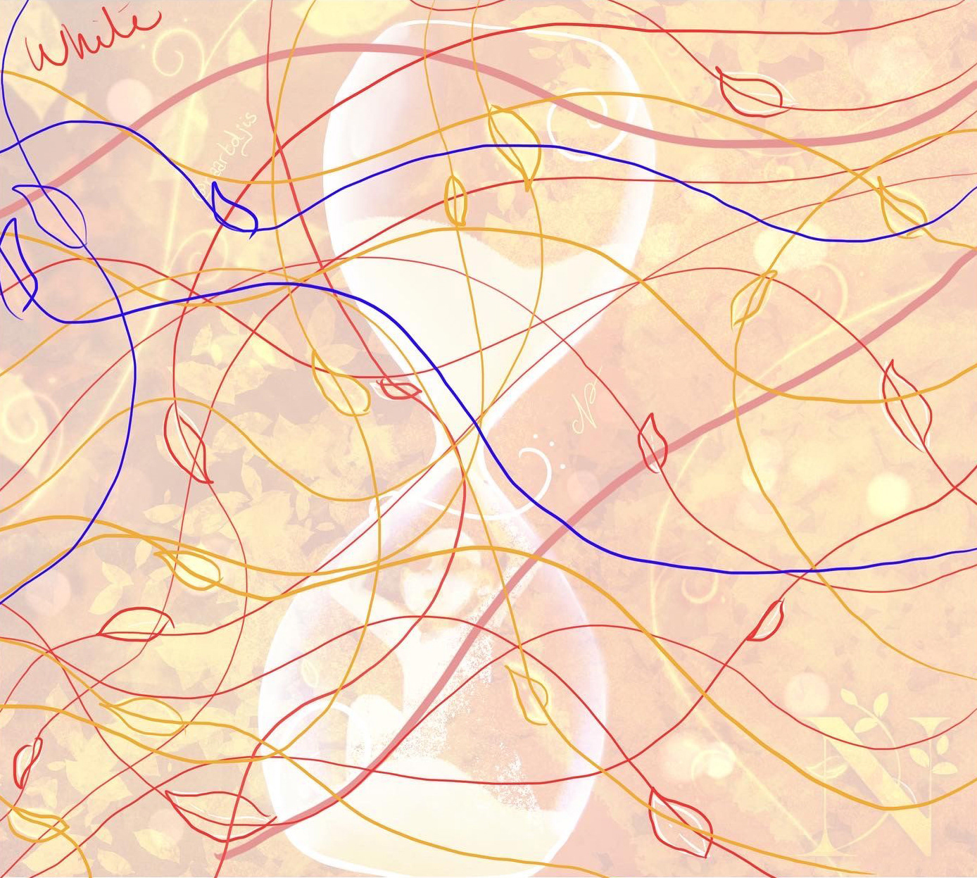 After imaginating the direction and the intensity of the wind (symbolised the the two light bold red lines), I roughly sketched the moves of each leaf (one color per leaves group). Then I imported my stekch into Adobe After Effects and used it as a reference to animate.